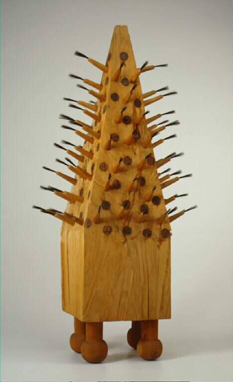DescriptionPyramidal/square cottonwood form with multiple 6-7" finger-like projecting pegs on all four sides. Hog bristles are inset at tips of these elements and extend outward like brushes. Interspersed among these are dark circular dots 2" in diameter that are wood-burned into the surface. The structure rests on 4 columnar legs culminating in spherical feet. The surface is rough and unfinished.Copyright© James Surls
