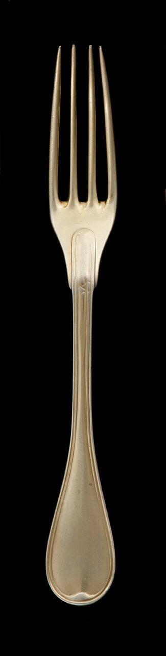DescriptionModified fiddle pattern handle with coat-of-arms consisting of fleur-de-lis, wreath, crown above and crois below on back of handle. Some vermeil showing.