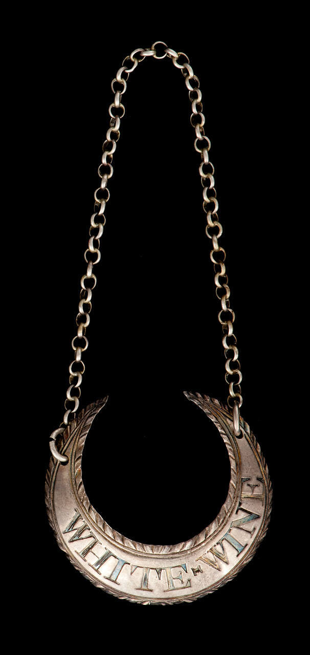 DescriptionExtended half moon with striated edges, chain. Labeled: WHITE-WINE. Marks: HB, lion passant.