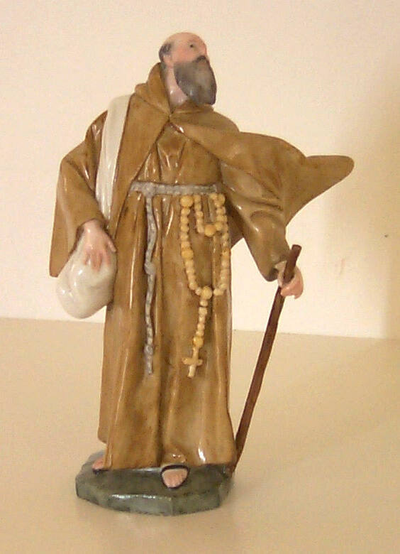 DescriptionMale figure, standing ona small plinth, gazing upward, dressed in a light brown monk's robe and cape. Robe is belted and a rosary hangs from the belt. A white bag is slung over the figure's pr. right shoulder. The left hand holds a brown walking stick. On the underside of the plinth are a blue wheel mark and the incised initials HM. Slight repair to stick, left hand and borders of coat.Published ReferencesK.H. Esser and Horst Reber, Höchster Fayencen und Porzellane, exh. cat. (Mainz, Germany: Altertumsmuseum und Gemäldegalerie der Stadt Mainz, 1964): no. 115, p. 72 (ill.).