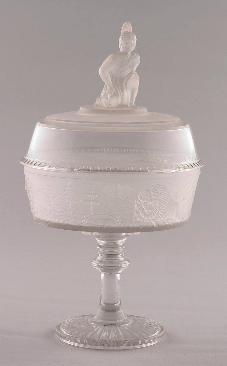 DescriptionKneeling Indian on top; decorative band with a pressed design of log cabin, buffalo and reindeer against Rocky Mountain background.