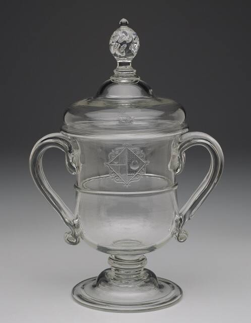 DescriptionA double-handled cup with waisted bowl on small compressed knop above a circular dome and folded foot; domed cover with "teardrop" finial. engraved with crest of a talbot sejant, or collared and lined argent and gules, in the first quarter crescent of the second; impaling (probably) the arms of Farnham; a crescent azure. with the arms of a widow of the Tutt family of Idmiston, Wiltshire.