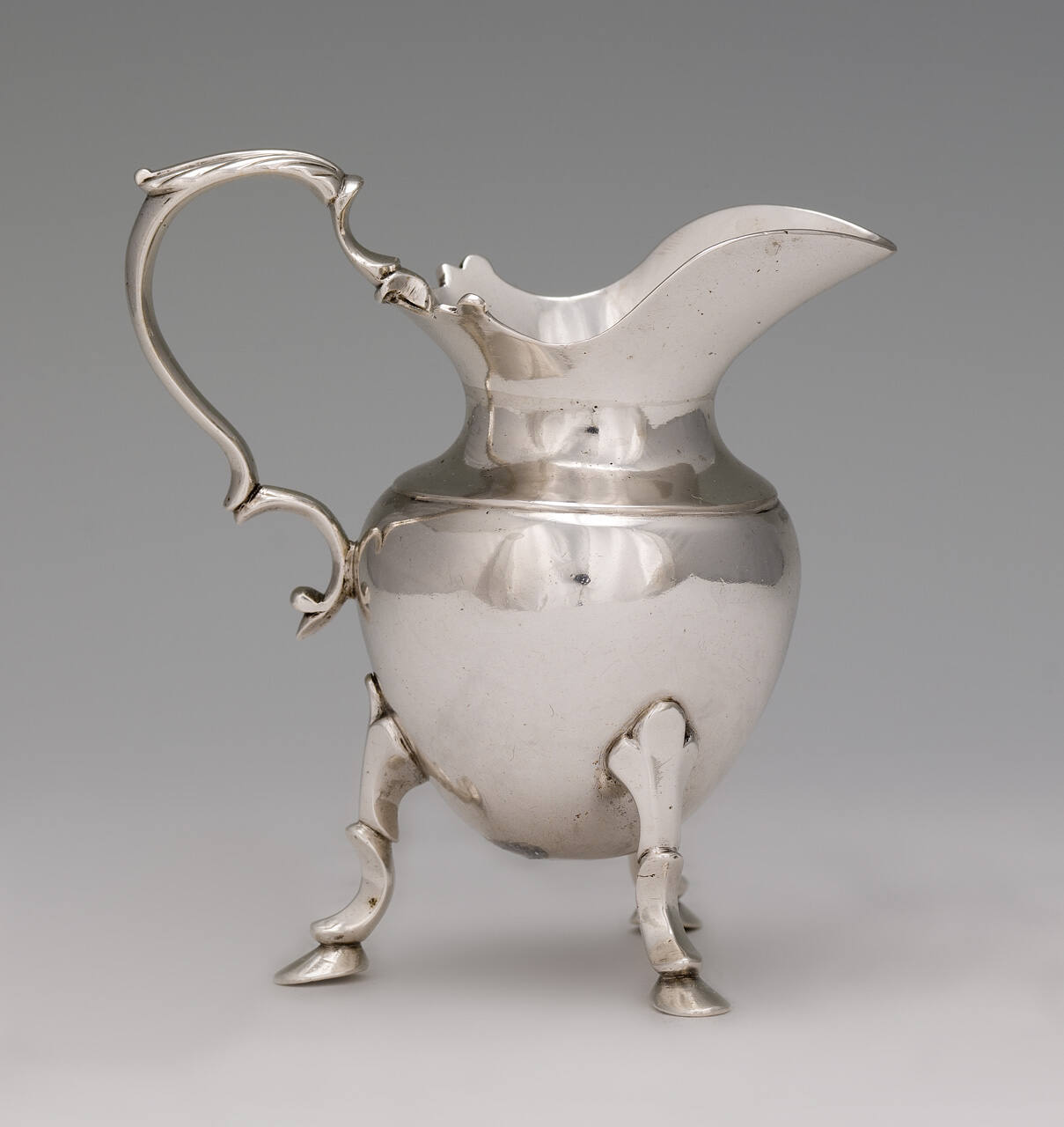 DescriptionPlain silver cream ewer on three hoof feet. Double scroll handle with applied leaf at top.