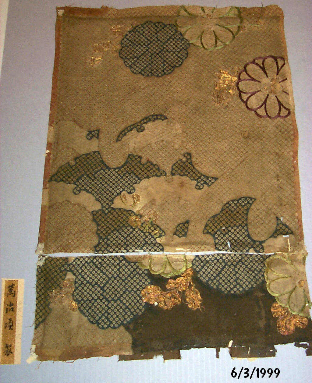 DescriptionFigured satin ground with tie dyeing (red areas), stencil tie dyeing (blue areas), and silk and metallic thread embroidery with wave, snowflake, chrysanthemum patterns.