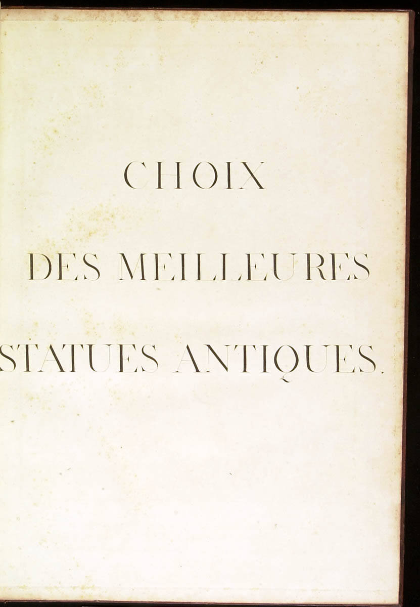 Transferred from Library Collection to The Nelson-Atkins Museum of Art, Kansas City, MO, 1999.George L. McKenna, Prints, 1460-1995 (Kansas City, MO: Nelson-Atkins Museum of Art, 1996), 308, 311, as Vol. 16 Choix des Mellieurs Statues Antiques, title page and 41 unno. pl. (incl. 1 pl., Statua del Gladiator Moribondo, by Andrea Rossi after Pietro Angeletti).