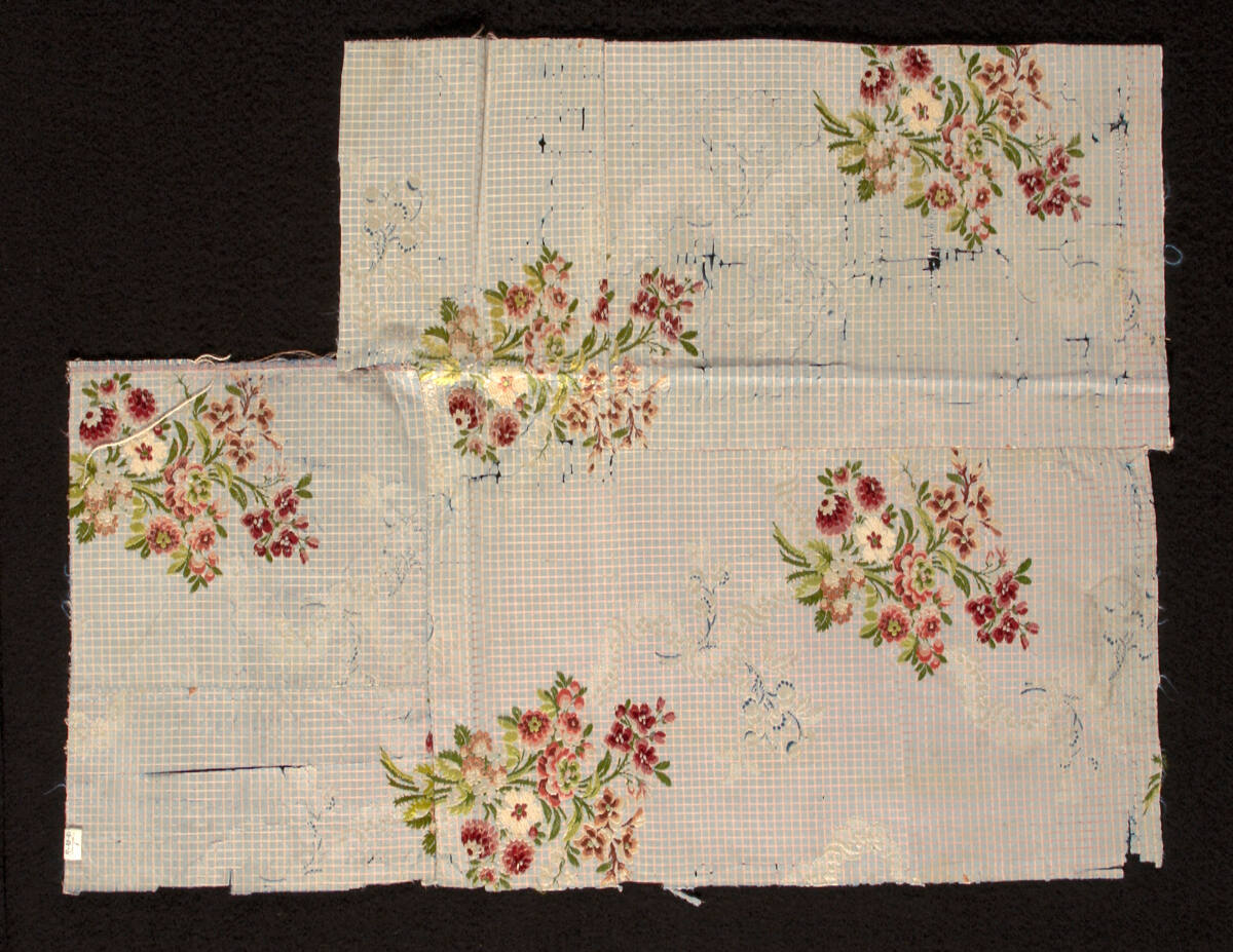 DescriptionThree pieces of blue and pink checked silk, brocaded with color silks. Pale blue taffeta with horizontal and vertical stripe in pink. Brocaded flowers in pink, red, green, and brown. Bunches of flowers connected by vrocaded ornament in white and blue.