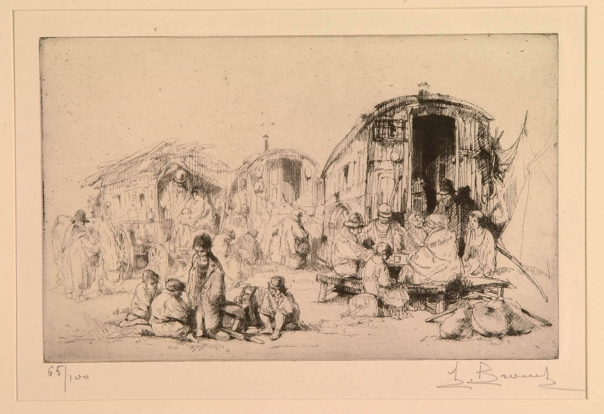 Auguste Brouet was considered one of the finest etchers of the 20th century. He grew up in the streets of Montmartre, where his mother owned a circus, and his work provides a fascinating record of a rapidly vanishing aspect of French life, with its street vendors, Romany caravans, and itinerant tradesmen. Although these subjects were a frequently romanticized in 19th-century pictures, Brouet’s portrayal of this downtrodden encampment is realistic and poignant. The Romany struggle to survive is summarized in the figure of the little boy in the foreground, whose downcast head and ill-fitting clothes reveal the hardships of this bohemian existence.