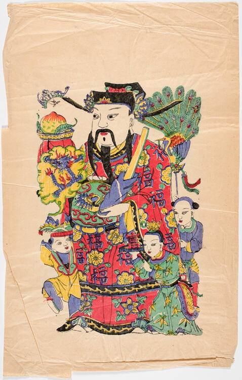 Gallery LabelComplementing the martial door gods are these heavenly officials, who dress in the attire of imperial civil officials. They are assigned to watch the entrances of various rooms inside the house, where the doors are often beautifully designed with openwork like the wood panel here. These officials present symbolic objects that will bring wealth and honor to the rooms. Specifically, the official on the top print presents a scroll inscribed with blessings; the center pair presents a fish and a peach that symbolize prosperity and longevity; and the bottom pair amplifies the blessings with five children, each holding a lucky symbol.