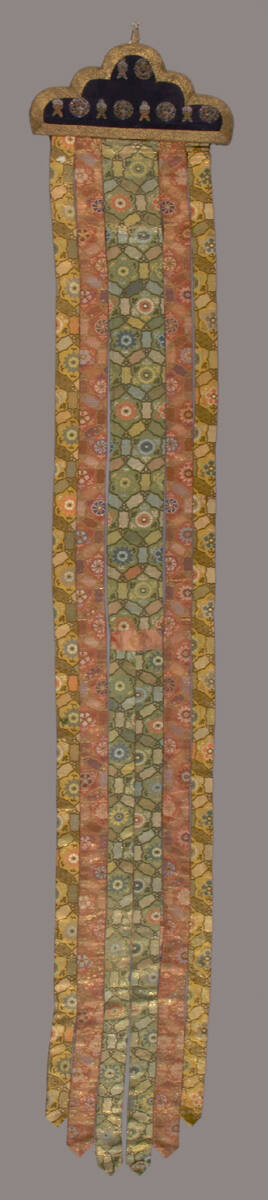 DescriptionUpper half has five strips, two outer ones of yellow, next two of red and center strip (twice as wide as others) of green. Lower half same except green center in two strips, making six in all. Dark blue brocade bordered with gold brocade over padded top.