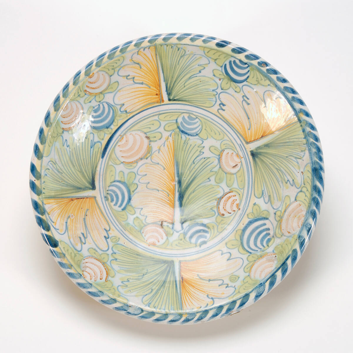 DescriptionCentral oak leaf in yellow and pale green surrounded by six stylized acorns alternately pale orange and blue. Border, a quartieri, with four oak lives interspersed with stylized acorns. Blue-dash border on rim.