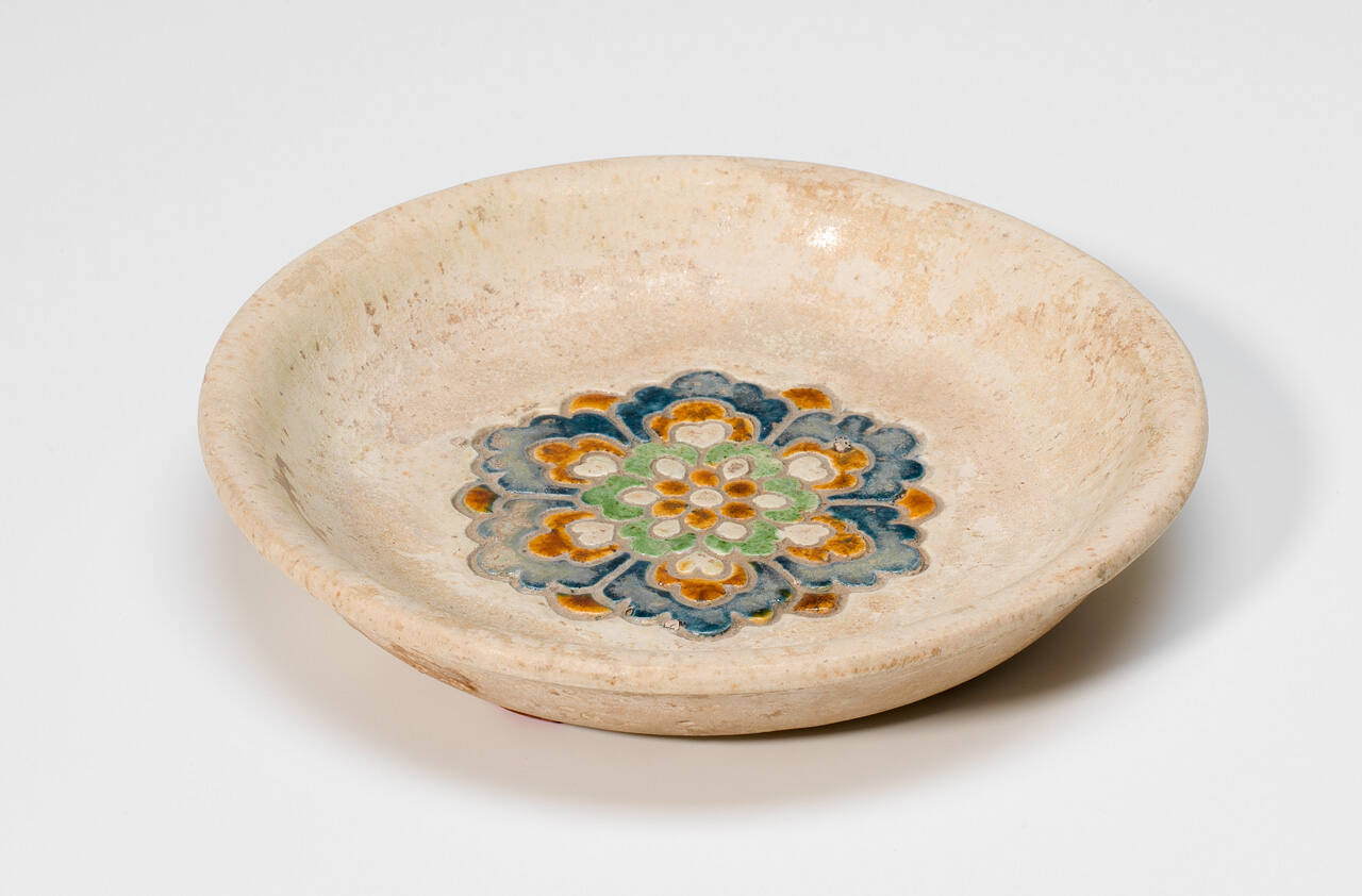 DescriptionSmall plate with a cream glaze, decorated in the center with a stylized flower in blue, orange, green, and white glaze.