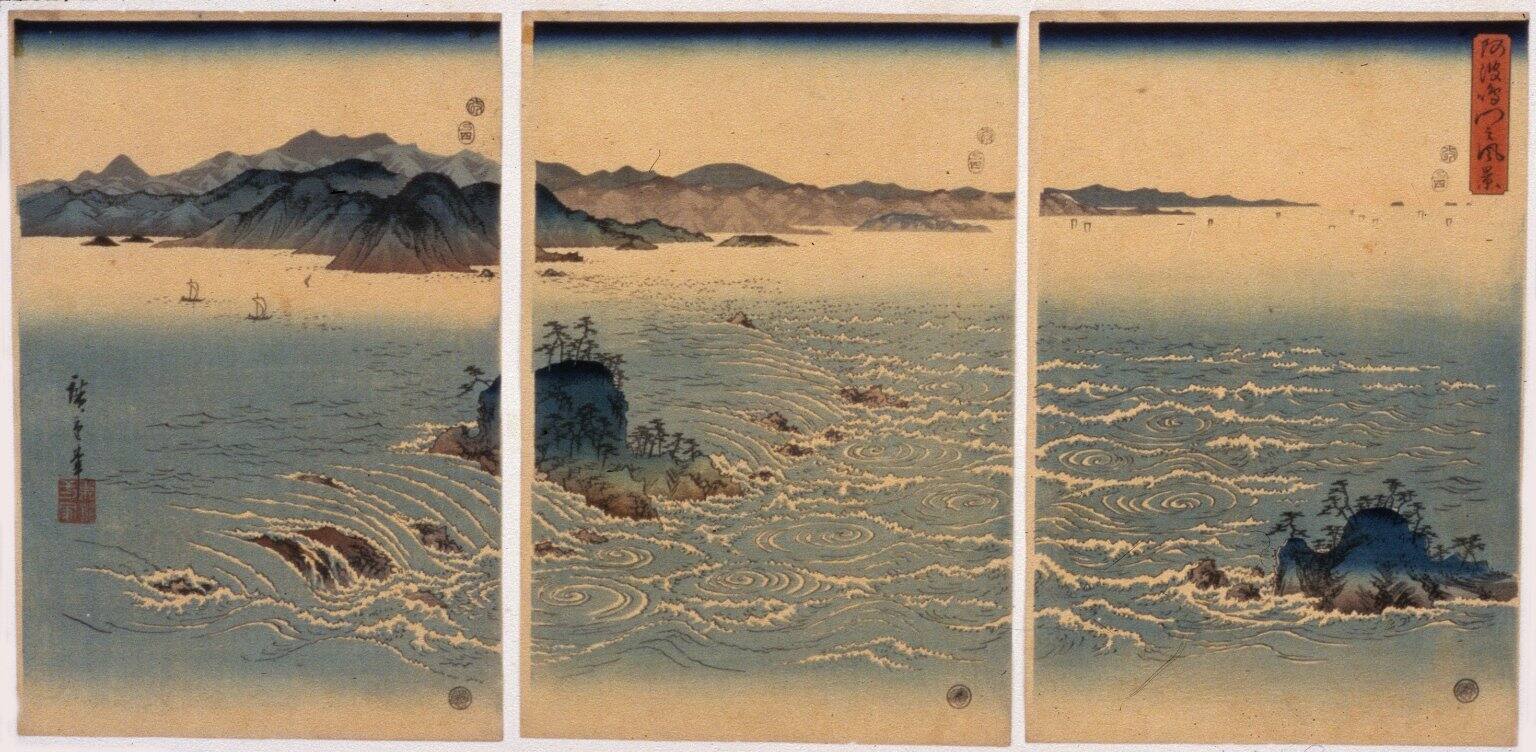 DescriptionA three-panel landscape depicts a panorama view of the straits at Naruto. In the foreground, the water is rapidly swirling around the two islands portrayed primarily on the right and the central panels. A distant mountainous coastline extending from the left panel to the right dominates the background. Several fishing boats sail along the coastline with two on the left and the rest receding into the distance on the far right.