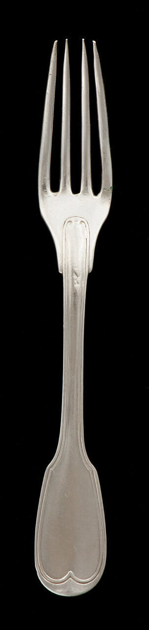 DescriptionHandle is in a fiddle-pattern, back of handle engraved with coat-of-arms consisting of fleur-de-lis, wreath, crown above and croix below.