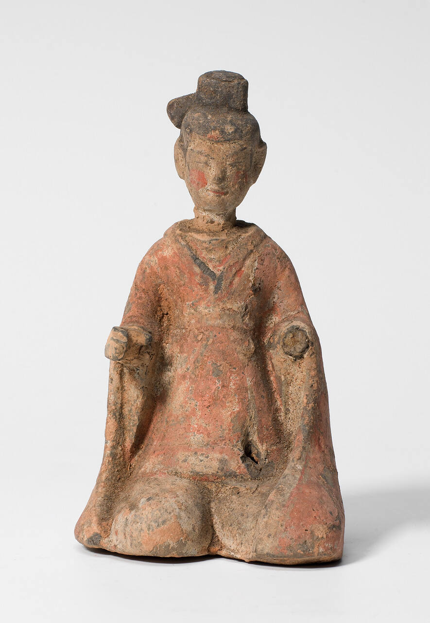 DescriptionFigure of a kneeling woman wearing simple robes, with hands outstretched directly to her front. Traces of polychrome, a red robe trimmed in black.Provenance