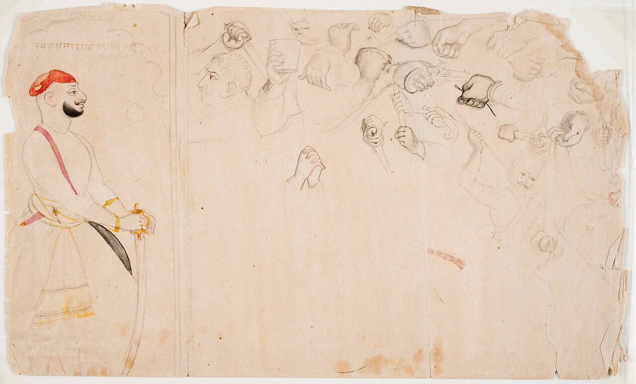 DescriptionUpper part of page filled with drawings of the torso of a man in European dress, unfinished, copied from an engraving. Figure wears wide-brimmed hat. Lower part contains studies of hands, some holding swords, and a full-length profile of a Rajput.