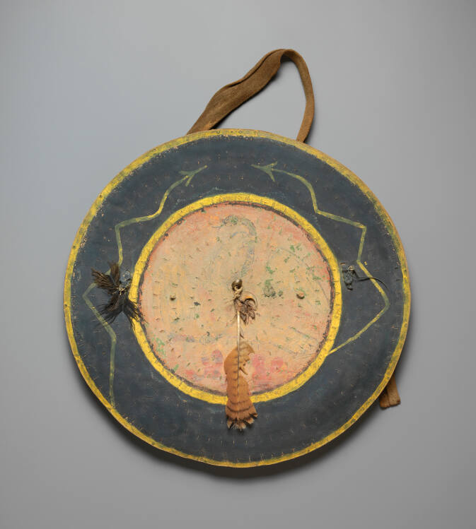 Gallery LabelThe history of this shield and cover is a reminder of the intermittent warfare and trade that characterized Native American and Spanish Colonial relationships throughout the early Southwest. Made by a Mexican or Colonial New Mexican artisan or by a Pueblo Indian, the heavy, two-ply buffalo hide shield was originally painted with an image of the Mexican second empire coat of arms (1823-1867) depicting an eagle grasping a snake in its beak. The shield was then acquired by a Plains Indian, presumably through capture in war or trade, and over-painted with a protective design of circles and lightning. The Mexican image is slightly visible beneath the Plains painting. The shield's yellow-painted deerskin cover, embellished with a secondary protective image, was added by the Plains owner.