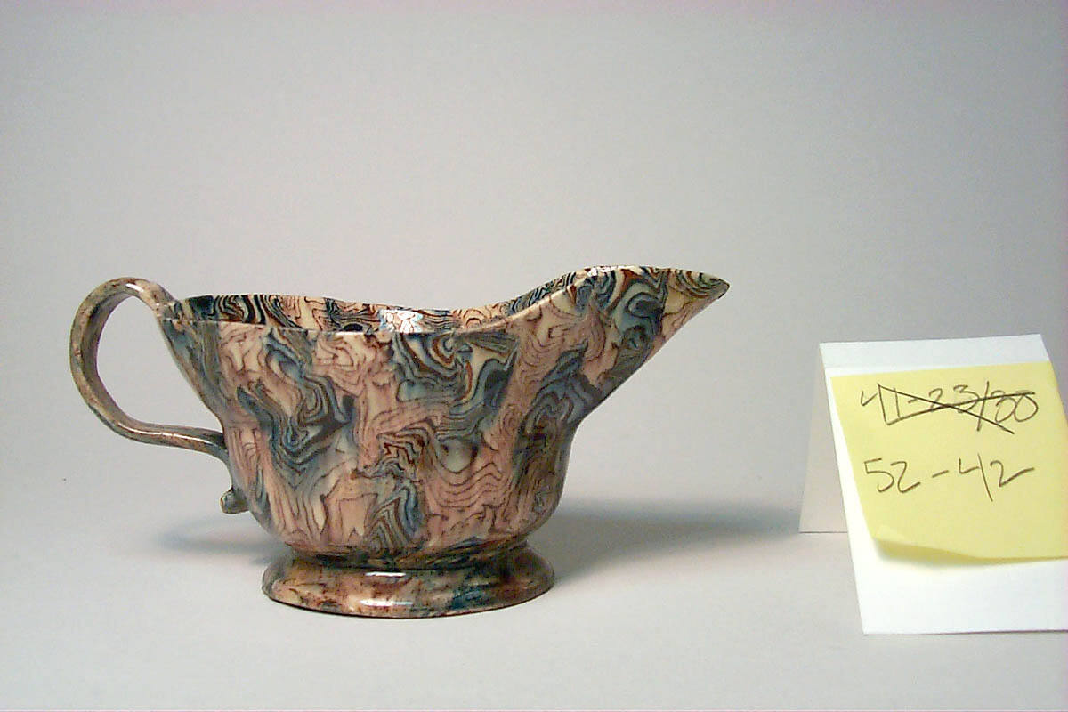 DescriptionSolid agate, finely veined in blue, brown and gray. Loop handle, elliptical base, flaring rim, wide projecting lip.