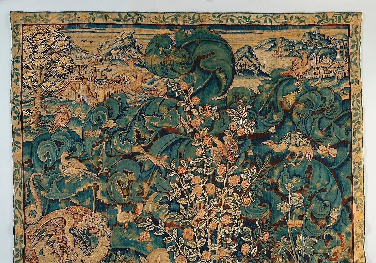DescriptionGothic tapestry, choufleau-type-blue green foliage with animals and landscape background. Original border.