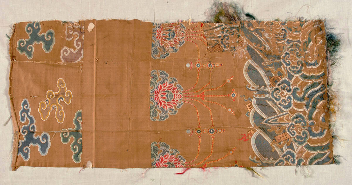 DescriptionPart of a Lama coat. Tan satin brocaded in polychrome and gold. Design of lotus with pendant jewels, waves and lucky symbols.