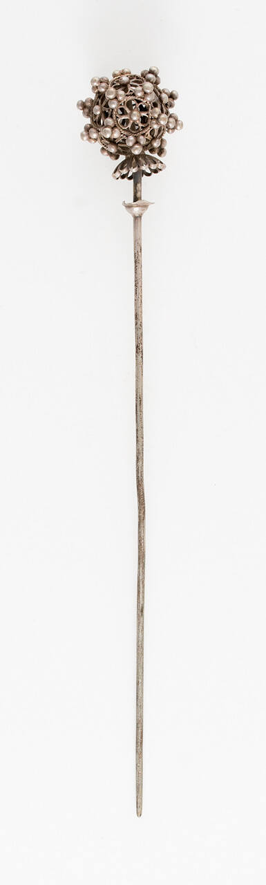 DescriptionSilver filigree hairpin with balls on the end.