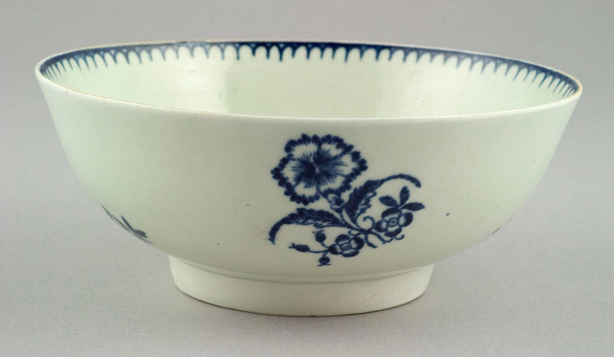 DescriptionDeep bowl set on vertical foot, flowers and insects spaced around outside, border on inside edge of inverted u-shapes, singles flower on inside bottom.