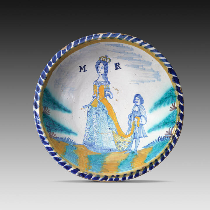 DescriptionDecorated with full-length figure of Queen Mary, with yellow crown; dressed in blue garment with all-over dotted circle pattern; yellow bodice extending into train borne by page, right. Blue-green and puce tree-brances, right and left. Blue andyellow terrain. Yellow stripe below rim; blue dashes on rim. Initials "M R". Perhaps Queen Mary of Modena, second wife of King James II.Gallery LabelThis charger probably commemorates Queen Mary, Catholic wife of James II (1658-1718), and the birth of her son, the Prince of Wales. He later became James III (1688-1766), exiled leader of the Jacobites, who unsuccessfully attempted to restore the English throne to the Catholic Stuarts.
