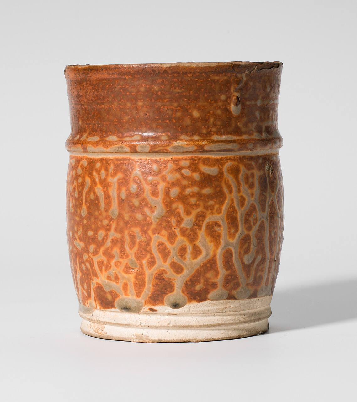 DescriptionCup with slightly bulging sides. Raised band below lip and beveled foot. Yellow and green-gray glaze over white slip.