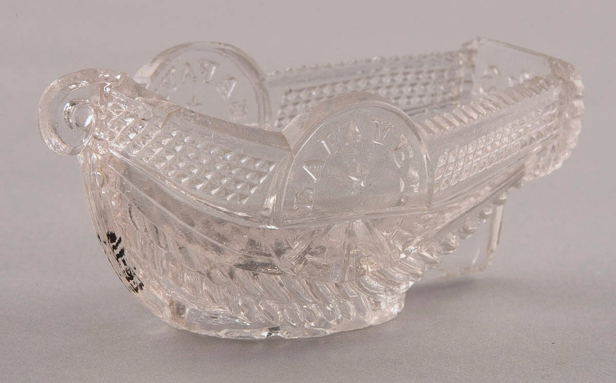 DescriptionBoat-shaped container; name "Lafayet" on starboard and port paddle wheels; "B. & S. Co." on stern; name "Sandwich" on inside and outside of keel.