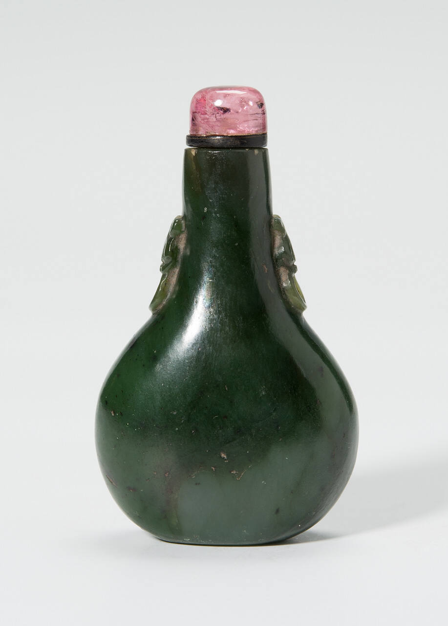 DescriptionFlattened pear-shaped jaster jade bottle carved with animal mask and ring handles, black collar and tourmaline stopper.