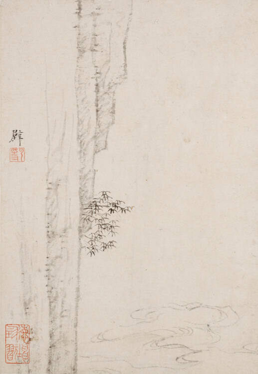 This album of studies represents the full development of Hongren's stylistic repertory just before his unexpected death a few days later. There are no poetic inscriptions, only a single word on each leaf denoting a particular landscape element: cliff, pond, etc. Without sacrificing monumentality or convincing solidity, he has been able to pare his vocabulary to a bare minimum of dry, pale strokes that produce fractured, crystalline rocks and mountains, more insubstantial and more empty, unpainted paper than form modeled of layered ink and texture strokes. Nature seems barren. Pines grow from cliffs at odd angles. Spatial contradictions are deliberately explored and given center stage for artistic effects of ambiguity and visual excitement. The leaf titled Cliff is an extreme example. In all, he presents us with a visionary world - remote and disembodied - yet believable.