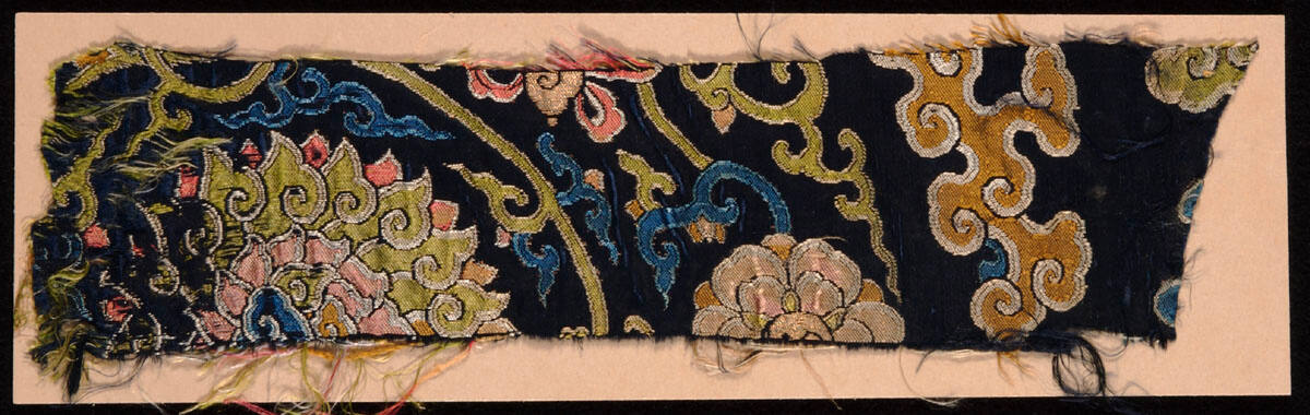 DescriptionDark blue silk brocaded in green, pink, blue and tan in pattern of lotus flowers, tendrils and clouds.