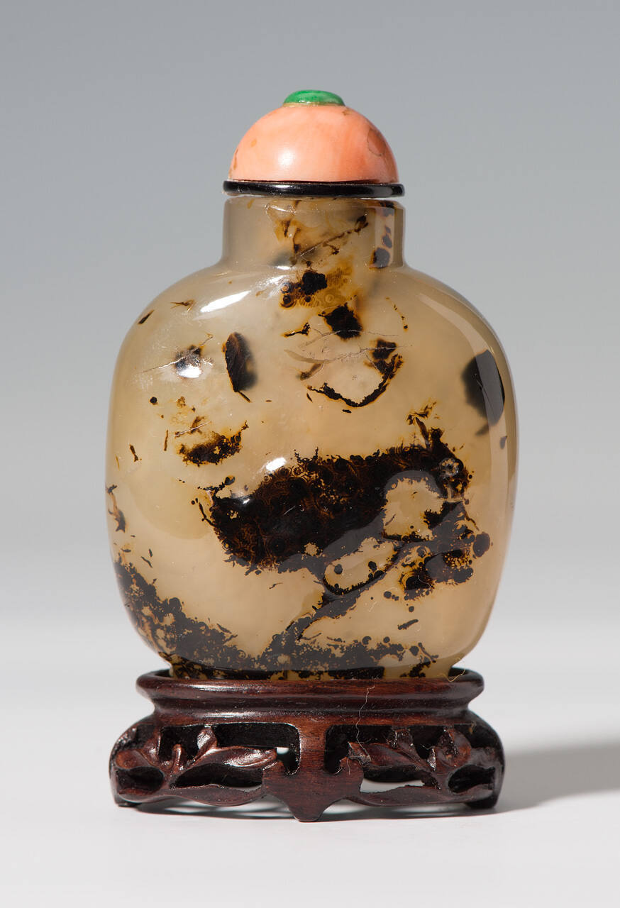 DescriptionUpright form, with rounded shoulders, the thranslucent mushroom-colored stone with dark-brown suffusions, use being made of these on the front to depict a large bird in the branch of a tree, well hollowed out.