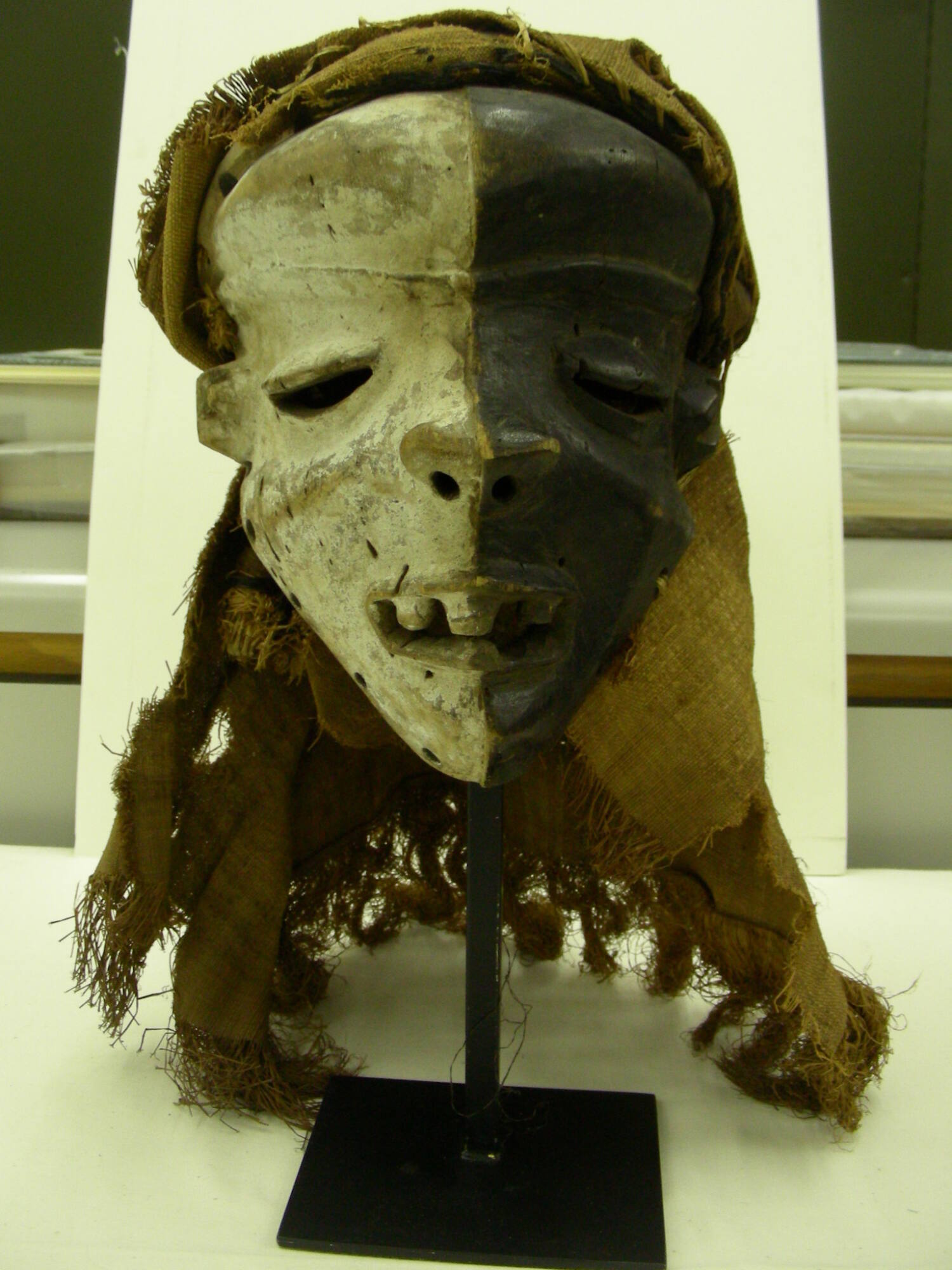 DescriptionDistortion mask with white right side and black left side distinct features, downcast slit eyelids, pointed chin, upturned nose, with headdressProvenanceWith Marc Leo Félix, Brussels, Belgium, stock no. FX97464, by July 17-October 2, 1997 [1];
