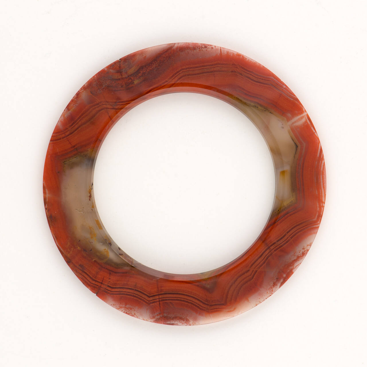 DescriptionOne of a pair of rings in red and white figured agate, possibly used on clothing.