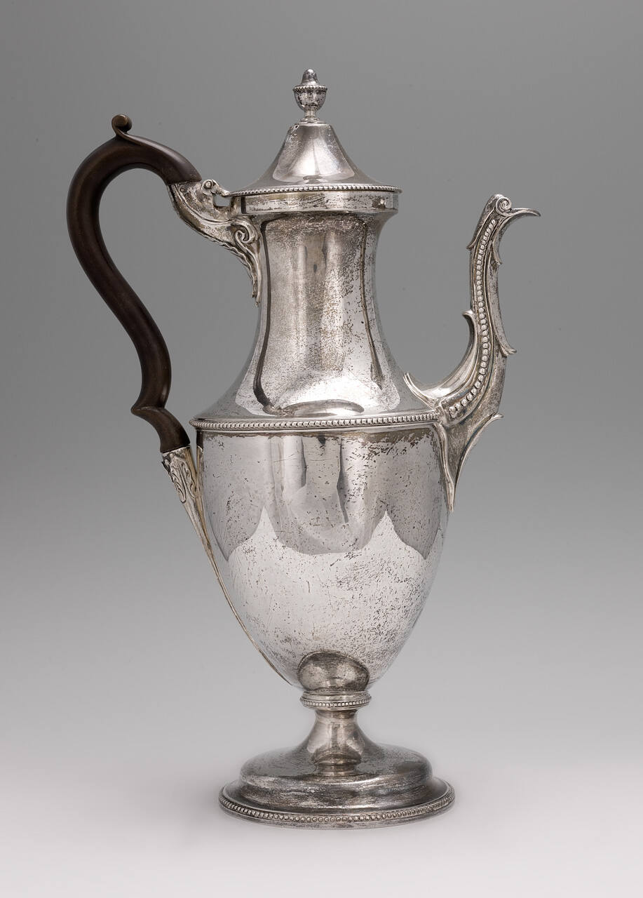 DescriptionPlain circular silver coffee pot; the lower part of the body is convex, the upper concave. They are joined at the center with a bead mount. Tall, plain foot, bead decorated at the upper part and outer edge. The vase-shaped cover with bead edge is surmounted with an urn finial. The spout has a row of beads on either side and leaf sockets support a wood handle.