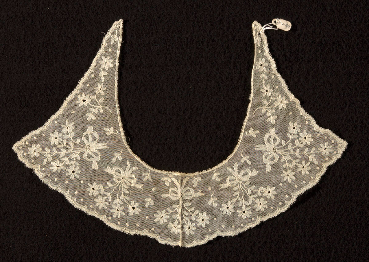DescriptionMachine-made net with hand-worked needle-run decoration, with some open work decoration and an added picot edging.