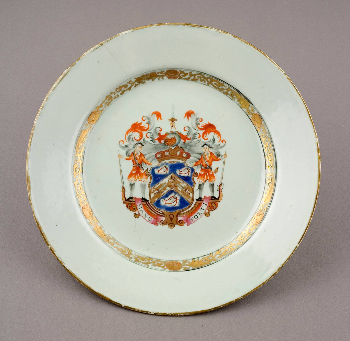 DescriptionPlate with Coat-of-Arms of Baron Reay Mackay in blue, red and gold, consisting of two red-coated figures with rifles on either side of escutcheon with bears the inscription MANU FORTI; gilt scroll and foliate border on cavetto; shoulder is plain except for narrow gold rim.