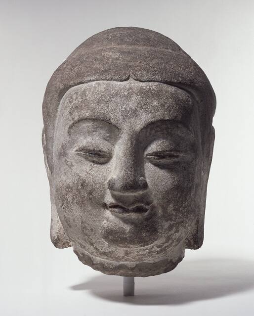 DescriptionThe larger than life-size stone head with elongated ears and round face with a double chin was chiseled away from its original larger stone sculpture, leaving noticeable extraction marks on the backside of the head. The frontal view illustrates the high arched eyebrows and full lips and nose. The head has traces of red and white pigments. The hair, which outlines the forehead and the top of the ears, has been sculpted to represent a chignon hair knot on the top of the head.Gallery LabelThis sandstone Buddha head originally resided in Cave Eight of the Tianlongshan Buddhist caves in Shanxi province. It is dateable to 584 A.D. by the stele outside the Cave Eight entrance. Cave Eight is approximately 14 feet on a side and 14 feet deep with a central core pillar that measures about 6 feet square. The core pillar had large seated Buddhas with attendants carved on each of its four directional sides. The Buddha head may be from either the northern or eastern side of the central pillar. Sculpted with elongated ears and round face with a double chin, traces of red and white pigment remain.
