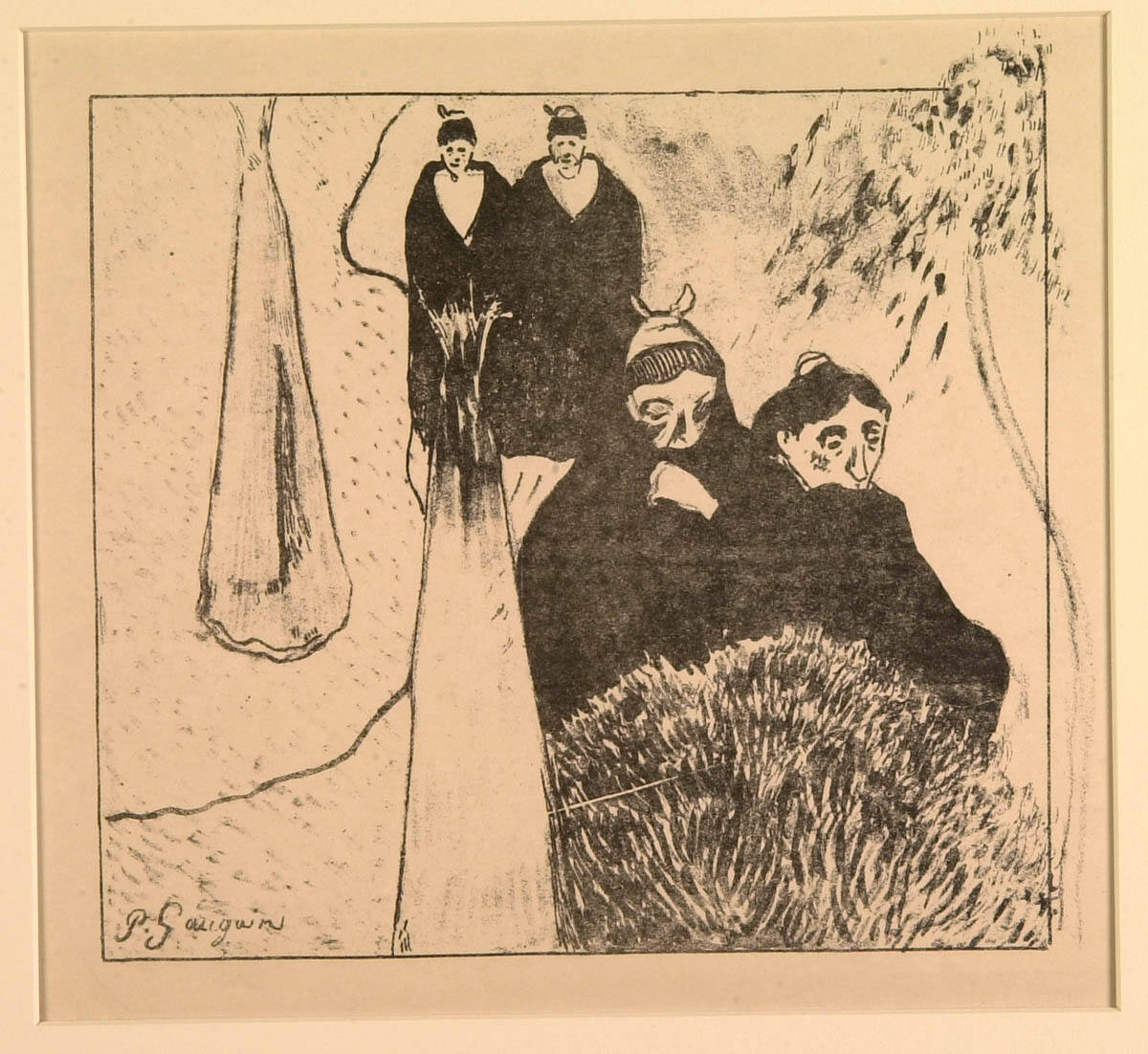 This print belongs to the Volpini Suite, a set of 11 zincograph prints named after the café where Gauguin displayed them during the 1889 World’s Fair. The subject was taken from a painting he made the year before during his brief but tumultuous stay with Vincent van Gogh in Arles, France. Struck by the noble qualities of Arlesian women, Gauguin shows them solemnly strolling through the park across the street from van Gogh’s house in the traditional shawls and headdresses of the region. The severely flattened and highly stylized forms are hallmarks of Gauguin’s “synthetist” style, in which lines and forms are abstracted to evoke the artist’s thoughts and feelings.