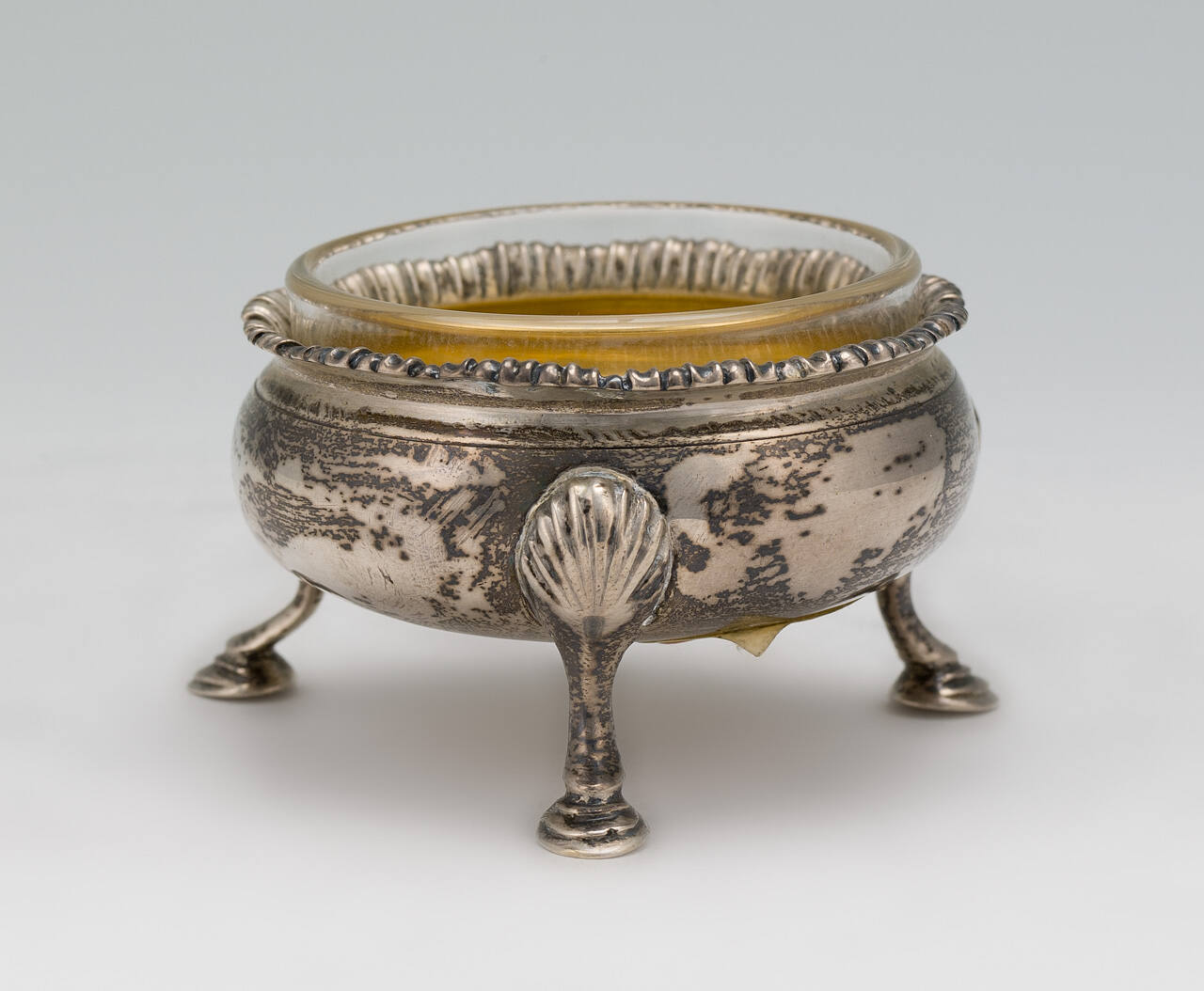DescriptionCircular bowl on three pad feet with shell motif; gadroon border, interior gilding. Marks on bottom of both: HB, lion passant, leopard's head crowned, date h.