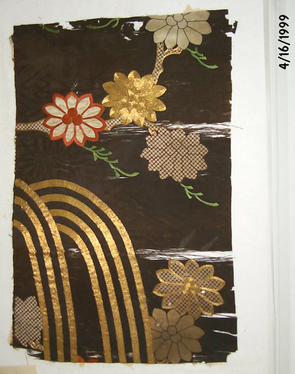 DescriptionBrown figured satin ground with paste resist dyeing, silk and metallic thread embroidery. Designs of Chinese pines and flowing water.