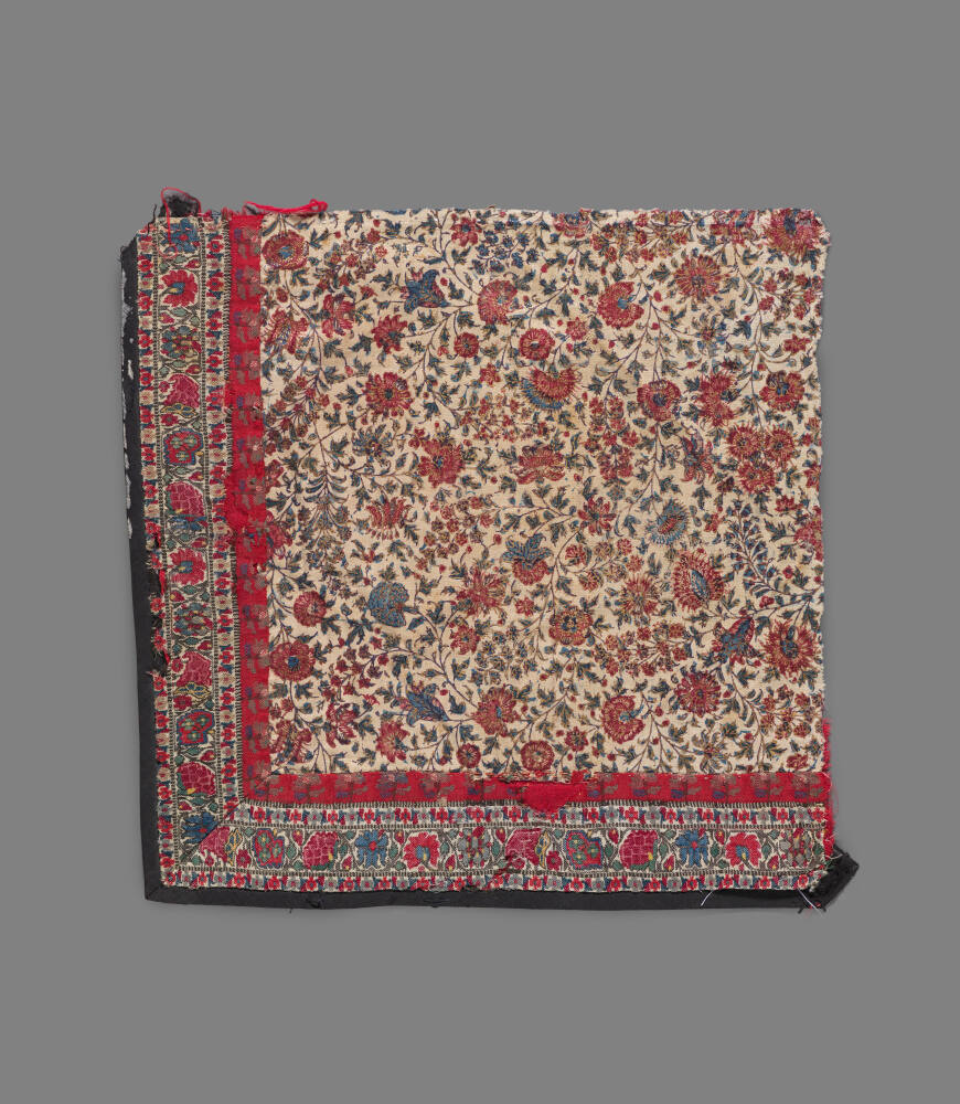 DescriptionUndulating stem design, single floral and spray in red and blue; Kashmir border sewn on.Exhibition HistoryNo exhibition history known at this time.
