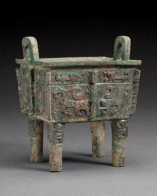 DescriptionRectangular vessel with four round legs and two ears on narrower ends. Ku at four corners and medial Ku on four sides. Sides ornamented in three plane relief with large T'ao-T'ieh masks and confronted dragons.
