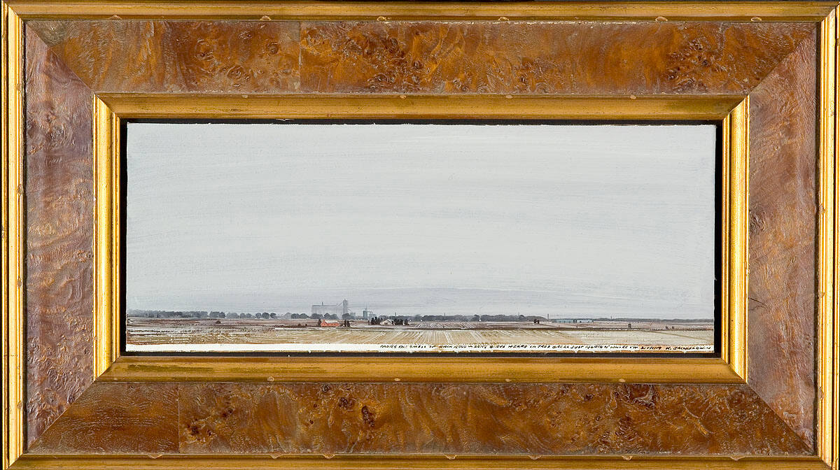 DescriptionMiniaturistic painting of a flat, midwestern rural landscape in late winter, mostly monochromatic in hue, with low horizon line; snow-covered ground in foreground and several buildings in middleground; in distance, a large, grain elevator and small, red house at left center, above all a grey overcast sky.Copyright© Keith Jacobshagen