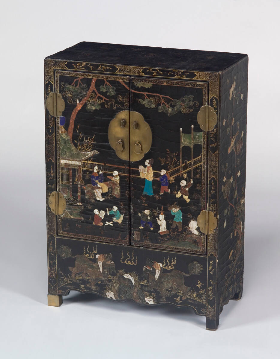 MediumBlack lacquer; gilded and painted, with inlay