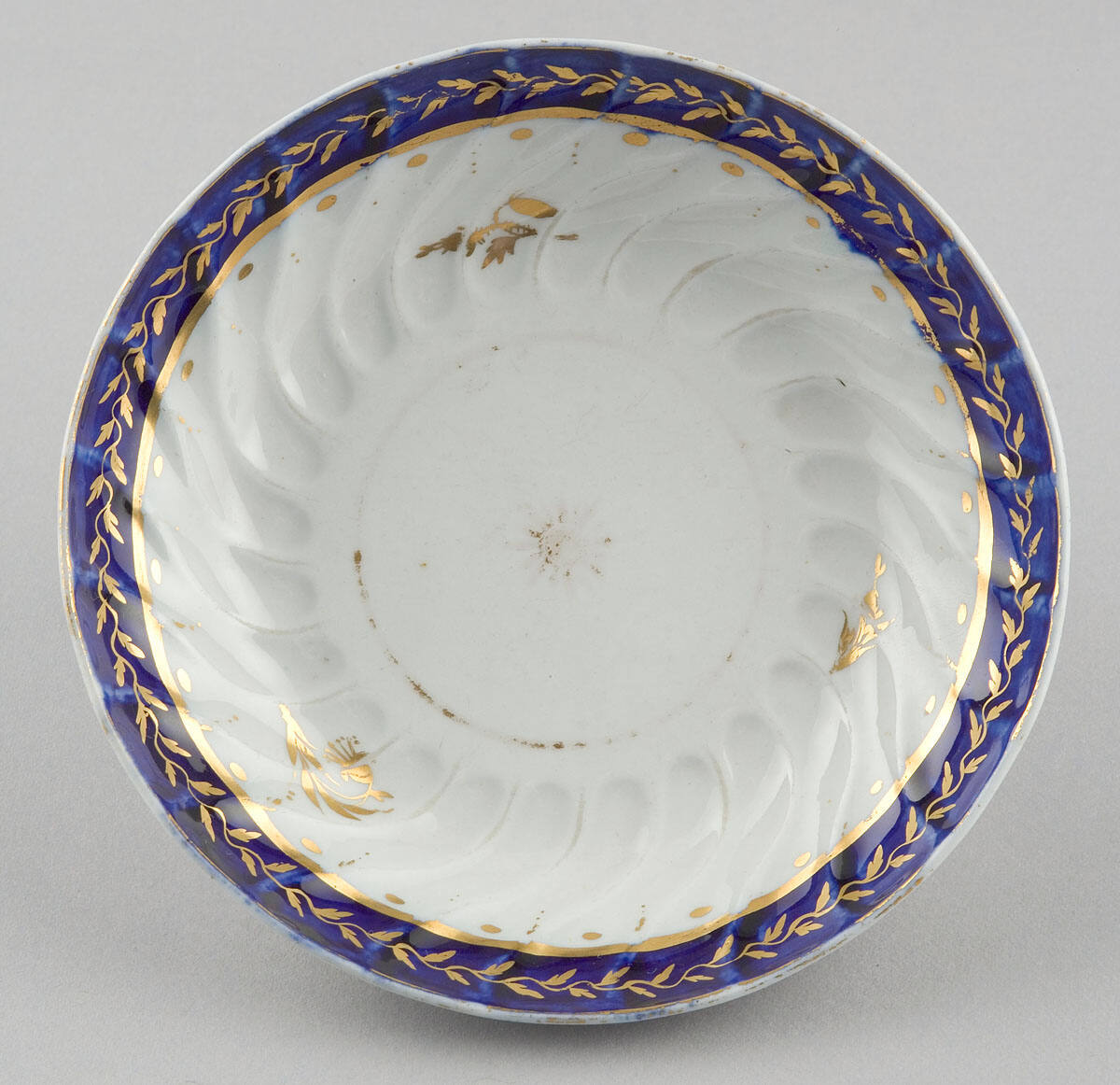 DescriptionWhite porcelain body with fluted cavetto. Dark blue border on rim edged in gold with gold foliate pattern through center of border. Centered sunburst pattern enclosed by gilt circle; three gold flowers. (Gold paint badly rubbed.)