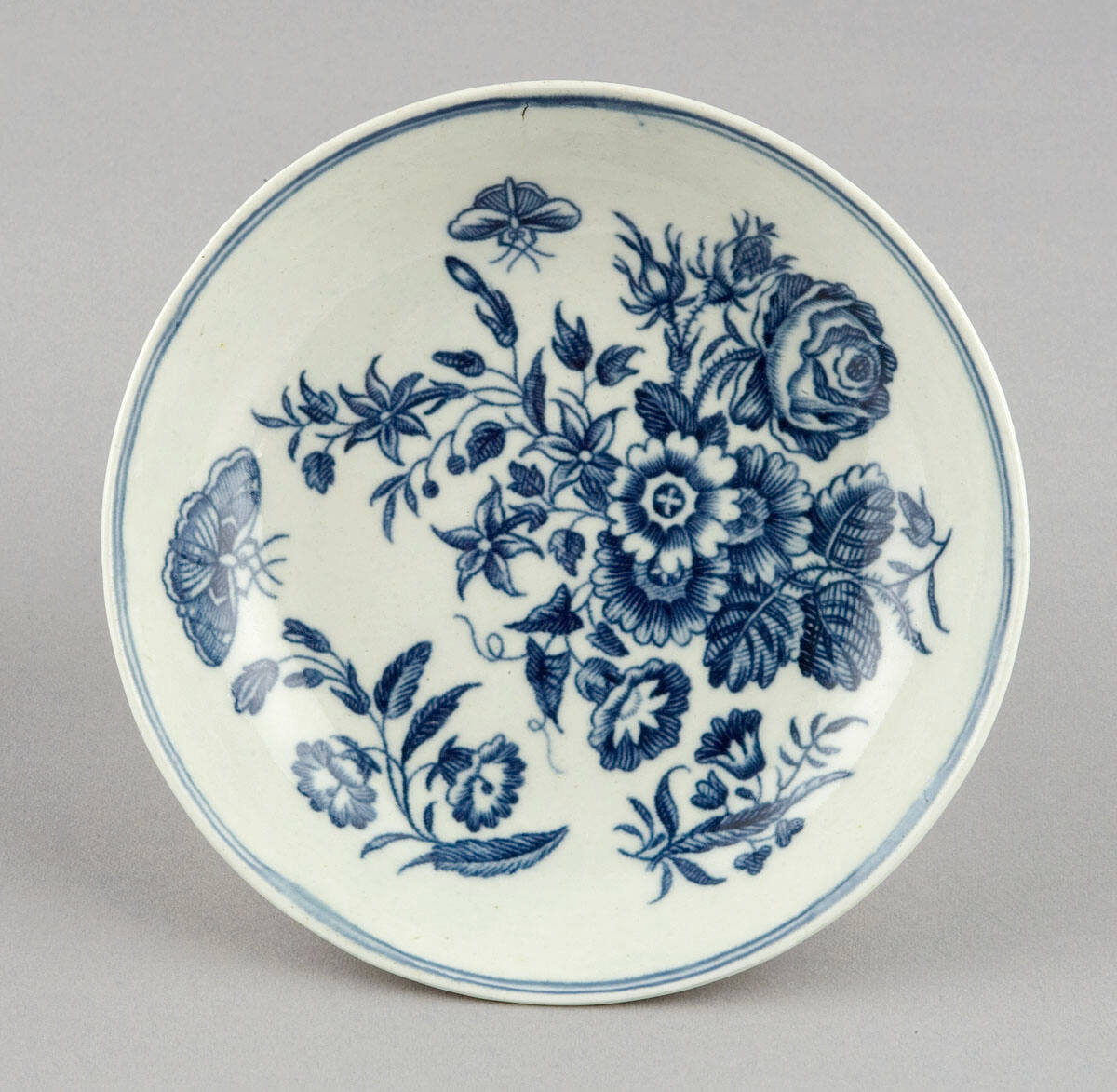 DescriptionTwo narrow stripes around inside top edge of saucer; flowers, leaves and winged insects on saucer.