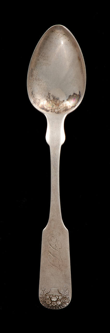 DescriptionFiddle pattern teaspoon decorated at the top of the handle with an embossed basket of flowers and on the back of the bowl with an embossed scallop shell.