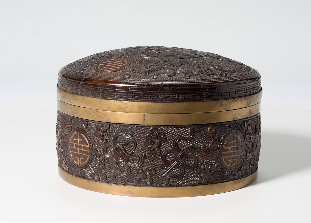DescriptionBrown wood box with carved designs of symbols of happiness including circular Shou characters in gold. Brass bands around the edges of the box. Lined with pewter.Exhibition HistoryOrigins: Collecting to Create the Nelson-Atkins, The Nelson-Atkins Museum of Art, Kansas City, MO, August 14, 2021-March 6, 2022.