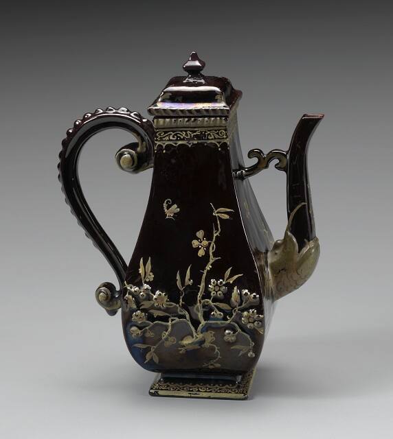 DescriptionA stoneware coffee pot and cover of quadrangular pear shape with notched scroll handle attached to the body by a bracket, and quadrangular curved spout, the whole covered in a dark brown glaze lacquered and gilt with prunus and insects, covering the molded prunus design, the domed cover with repaired knop.